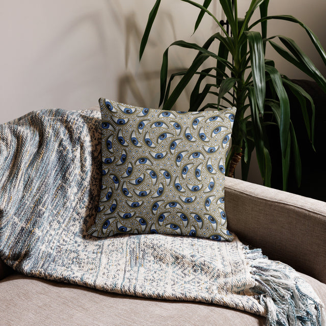 This premium throw pillow features a captivating geometric pattern inspired by vision, perspective, and self-awareness. *Eye to I* symbolizes the journey from external observation to inner understanding, making it a perfect accent for contemplative or modern spaces.