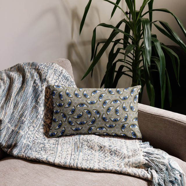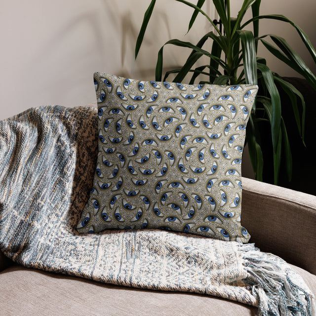 This premium throw pillow features a captivating geometric pattern inspired by vision, perspective, and self-awareness. *Eye to I* symbolizes the journey from external observation to inner understanding, making it a perfect accent for contemplative or modern spaces.