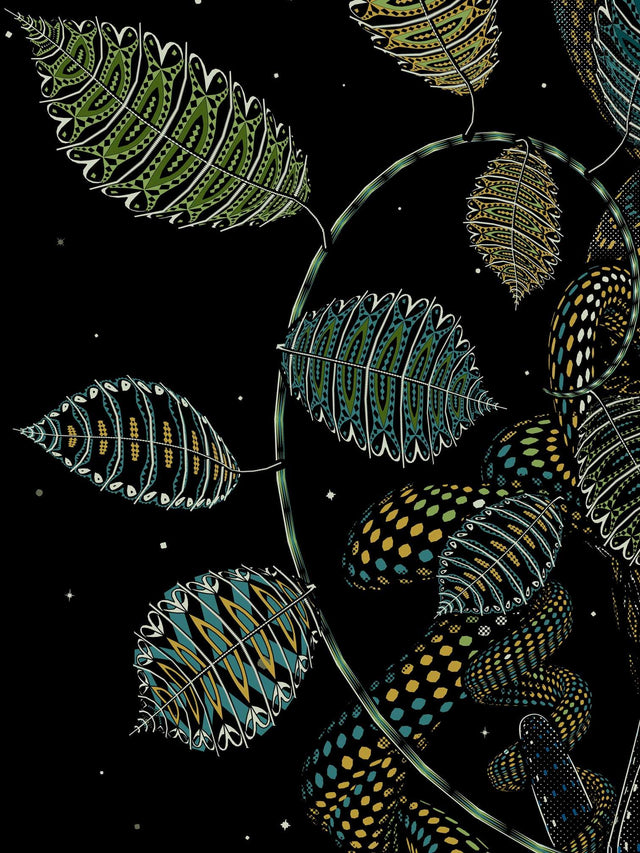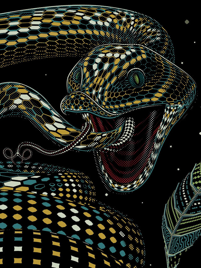 Additionally, there is an anaconda serpent on the top of the woman's head , The Anakonda serpent, is a powerful symbol that is often associated with ayahuasca. The shedding of the anaconda's skin is a metaphor for personal growth and spiritual evolution, and is seen as a guide or ally on the ayahuasca journey. This helps participants navigate the inner realms of the psyche and access deeper levels of understanding and insight.